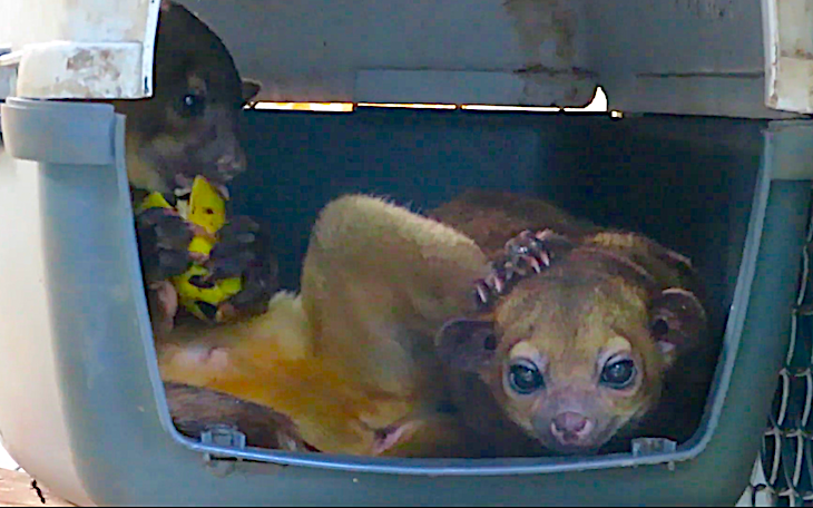 When I read “honey bear”, I envisioned a Winnie the Pooh-type licking honey off his paw. But I guess a honey bear (not to be confused with the honey badger, who don’t give a shit) is another name for the tropical rainforest mammal “kinkajou” (teeheehee), and they’re closer to raccoons than cartoon teddy bears. Now, I’m sure all the wildlife professors reading this are swirling their mid-afternoon cabernets and chortling at my ignorance, but I didn’t know, OK?!? Anyway, this post is about a kinkajou who’s forced to get physically creative to avoid sharing his yummy fruit with a friend. Looks like someone was an only child!